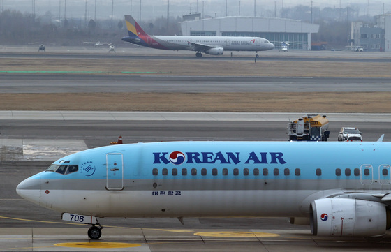 김포공항 계류장에서 대한항공과 아시아나항공 소속 여객기가 이륙 준비를 하고 있다. |